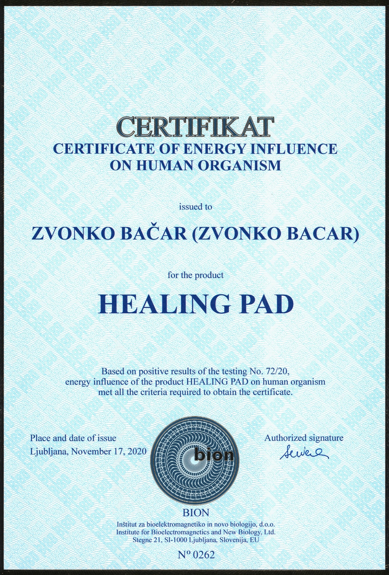 Healing Pad has been tested and certified by the BION Institute for Bioelectronmagnetics and New Biology.